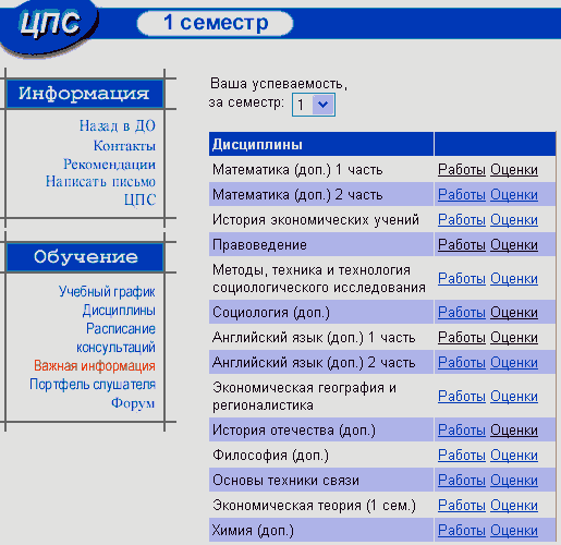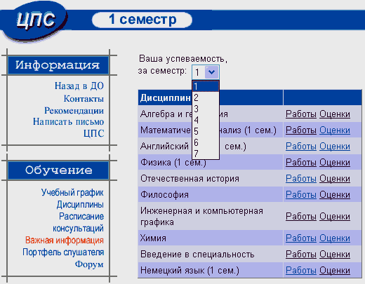 В графе “Оценки” Вы увидите результаты Вашей учебы и сможете проконтролировать, проставленные администраторами учебного процесса перезачеты по дисциплинам, изученным Вами в колледже (университете) при получении предыдущего образования. Эти оценки должны соответствовать перезачетам по дисциплинам, проставленным в полученном Вами по электронной почте индивидуальном учебном плане.
